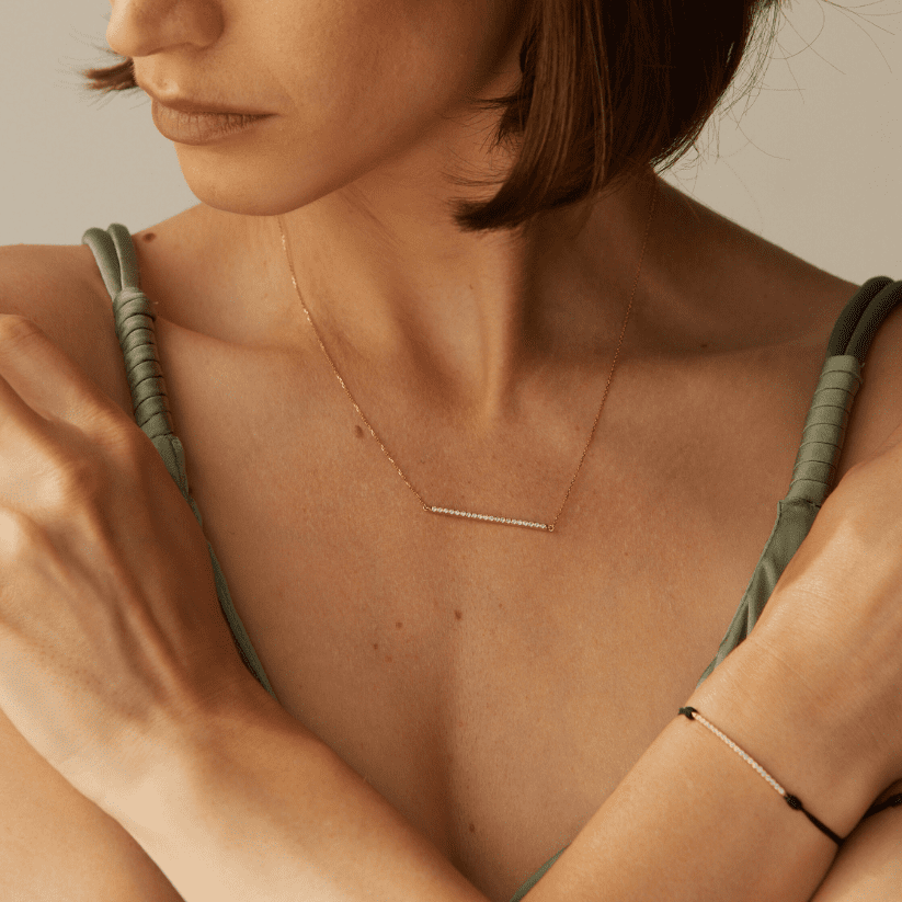 The Adachi Bracelet features a minimalist and sophisticated design. A delicate pavé bar is presented on a slender cotton rope, reflecting the flat crest of the volcano. This combination captures the essence of Adachi's mountain inspiration.