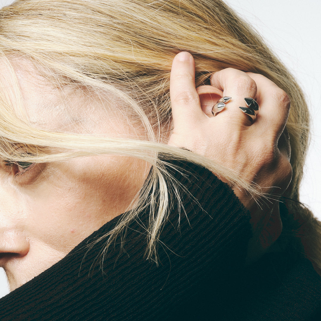 この素材について: 92.5% pure recycled silver content, giving it a bright, shiny and lustrous appearance. A valuable metal that allows versatility, accessibility and beauty in fine jewelry.